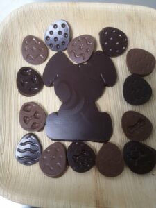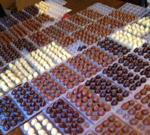 Pour les ateliers « pralines express », j’apporte les ingrédients nécessaires aux intérieurs (praliné, caramel,…) tandis que pour les ateliers complets, les intérieurs sont réalisés par les participants.