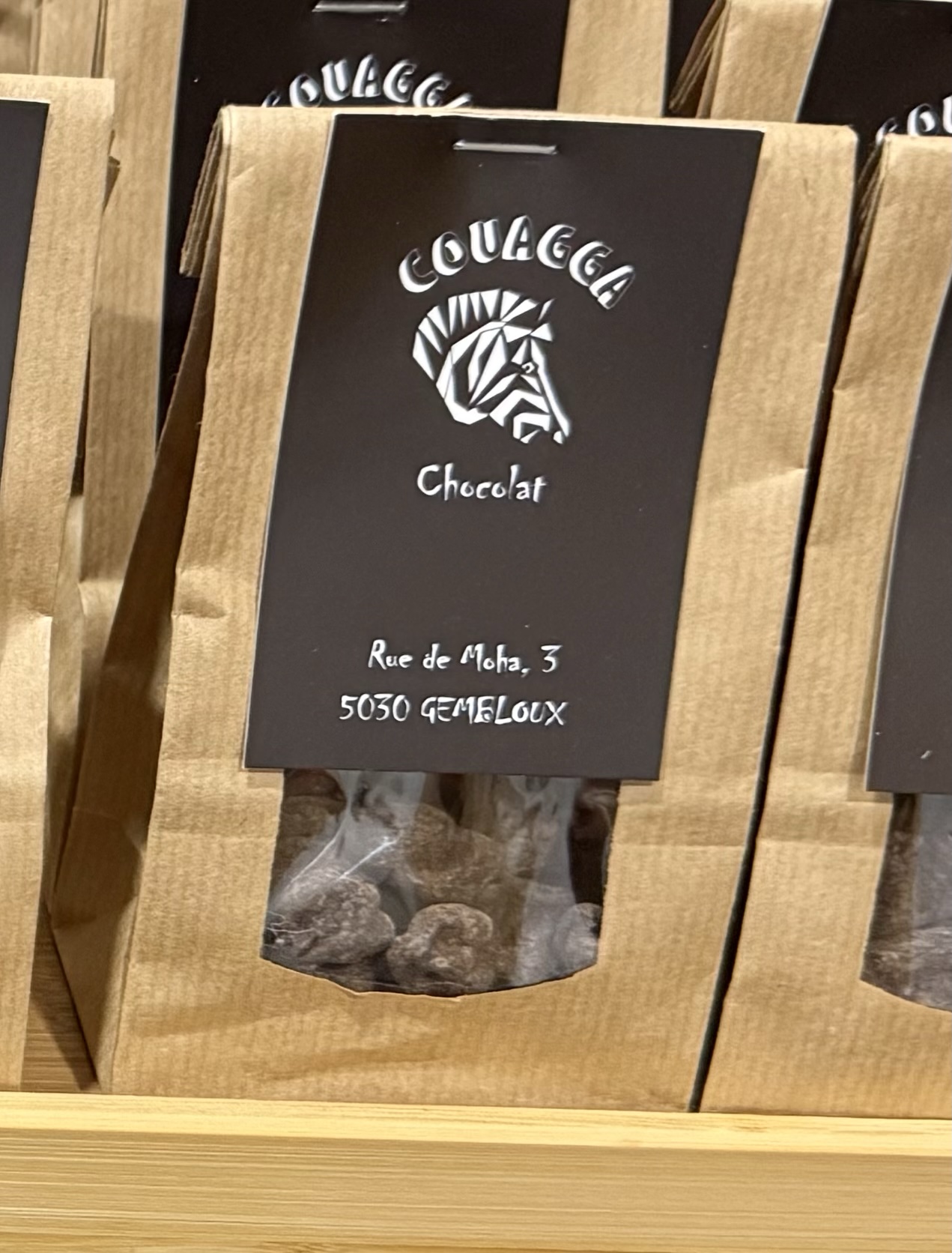 Ingrédients : gingembre confit bio (gingembre, sucre de canne), chocolat noir bio et équitable (pâte de cacao, sucre de canne, beurre de cacao).